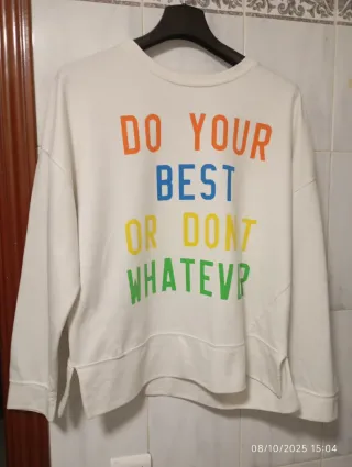 Sudadera blanca con un diseño de texto llamativo. - Mensaje DO YOUR BEST OR DONT WHATEVR en varios colores. - Cuello redondo. - Mangas largas. - Bajo con aberturas laterales.