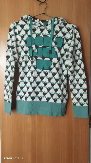 Sudadera con estampado de corazones y detalle en el pecho. - Blanco, verde y marrón. - Cordones ajustables en la capucha. - Puños y bajo elásticos. - Tiene alguna bolita (en la sisa), pero está perfecta. - 95% algodón+ 5% elastano