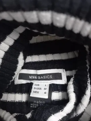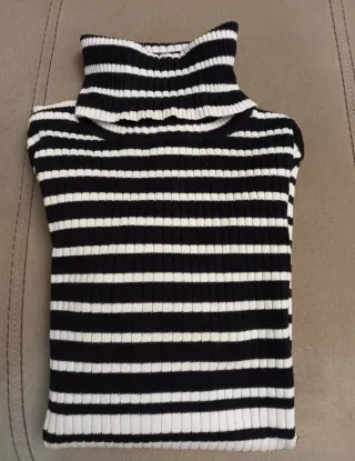 Jersey de rayas clásico en blanco y negro. Presenta un diseño con botones dorados en los hombros. Es talla única pero equivale a una 38-40, es muy elástico, tiene 20% elastano. Nunca lo he usado, solo le falta la etiqueta que la corte. - Cuello redondo. - Manga larga. - Detalle de botones dorados en los hombros.