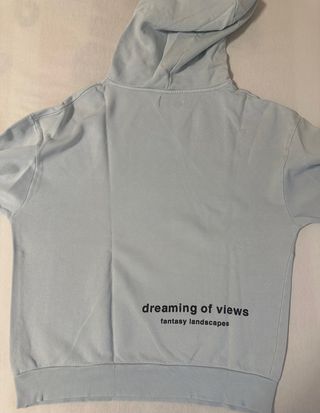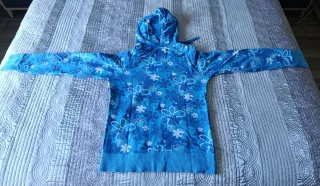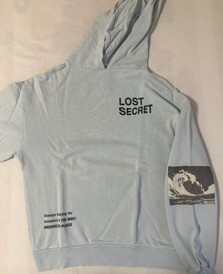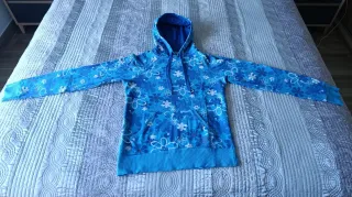 Sudadera de manga larga con estampado floral en tonos azules y blancos. Tiene un bolsillo delantero y cordones ajustables en la capucha. Marca Pull&Bear (xdye), talla L. En perfecto estado.