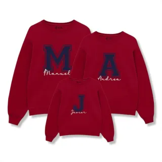 Conjunto de sudaderas personalizadas con iniciales y nombres. - Diseño con inicial grande en rojo. - Nombre debajo de la inicial en blanco. - Cuello redondo.