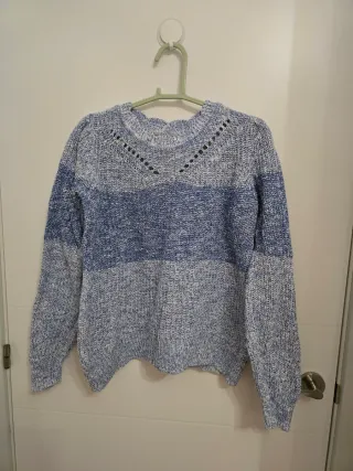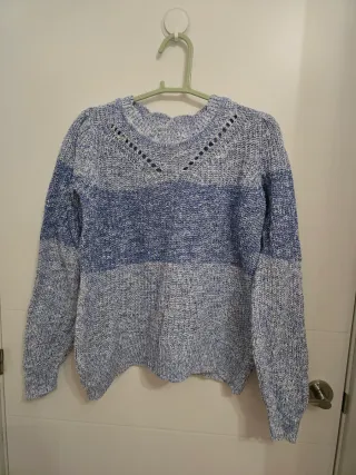 Jersey de punto con un diseño de rayas en tonos azules y blanco. Tiene un escote redondo con detalles calados. - Manga larga. - Tejido de punto. - Diseño a rayas.