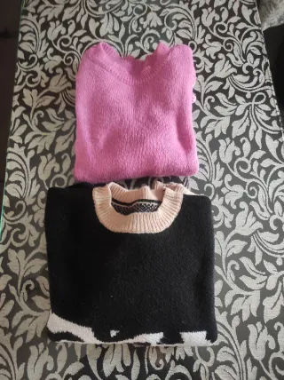 Conjunto de dos jerséis para mujer. - Jersey rosa de punto. - Jersey negro con cuello y detalle en blanco y beige.