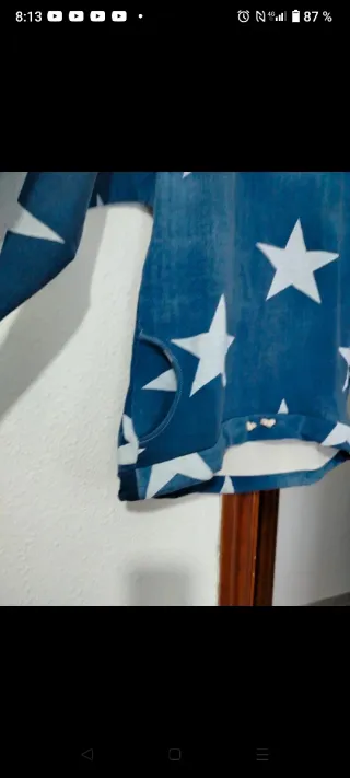 Sudadera con un diseño llamativo de estrellas. - mide de axila a axila 53 cm y largo 66 cm. - Manga larga. - Cuello redondo. - Estampado de estrellas blancas sobre fondo azul.