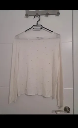 Elegante blusa de manga larga con un diseño delicado. - Adornada con pequeñas perlas. - Tejido ligero y transparente en la zona del cuello y hombros.