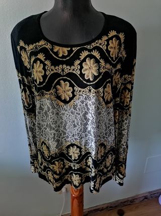 Conjunto de chaqueta y jersey, de punto, en color blanco y negro los abalorios tipo azabache y perlitas en blanco. Pone talla M pero da bastante talla, XL XXL, XXXL, ver fotos están las medidas. Usado en tres ocasiones, esta nuevo y muy cuidado. comprado en el corte inglés. Edición Limitada.