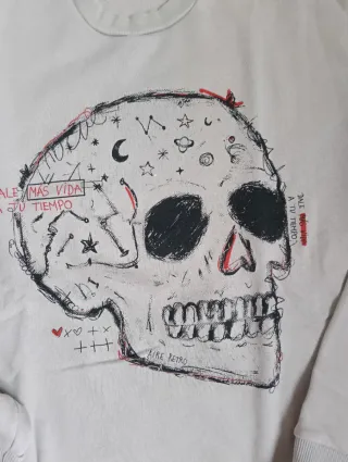Sudadera con un diseño gráfico de calavera y elementos celestes. - Estampado frontal de calavera con detalles en rojo y negro. - Motivos de estrellas, luna y constelaciones. - Firma AIRE RETRO en la parte inferior del diseño. Tiene un puntito blanco en un puño como se ve en última foto