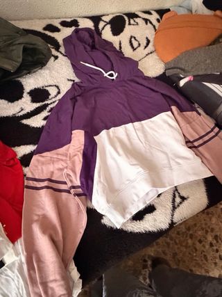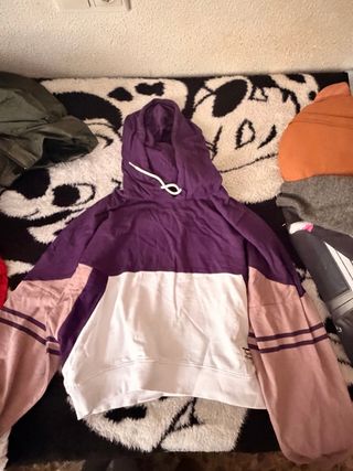 Sudadera con capucha de la marca Inside, talla S, en diseño color block en tonos morado, blanco y rosa. Muy cómoda y calentita, con bolsillo delantero y estilo casual/deportivo. Ideal para looks relajados o streetwear. En buen estado, con uso normal.