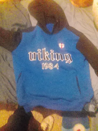 Sudadera con capucha y diseño Viking 1984. - Parte frontal azul con texto blanco. - Mangas y capucha en color negro. - Bolsillo tipo canguro.