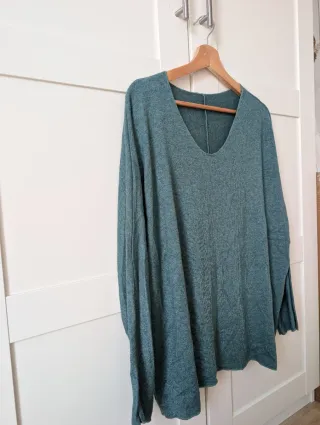 Jersey de punto grueso con un diseño de canalé vertical que le da textura. Su corte oversize lo hace muy cómodo y versátil. Talla grande, perfectamente puede servir para una M o L dependiendo si te gusta llevarlo holgado o ceñido. Sin duda, este jersey no es ceñido. Nunca lo he usado. - Cuello alto. - Manga larga. - Bajo y puños de canalé.