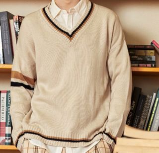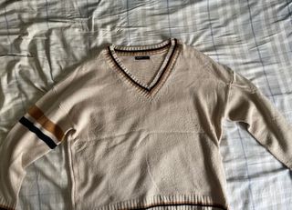 Jersey de punto con cuello en V y detalles de rayas. - Diseño de hombros caídos. - Ribete en contraste en cuello, puños y bajo.