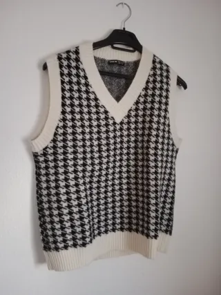 Chaleco de punto con un clásico patrón de pata de gallo. - Diseño sin mangas. - Cuello en V. - Ribete en contraste.