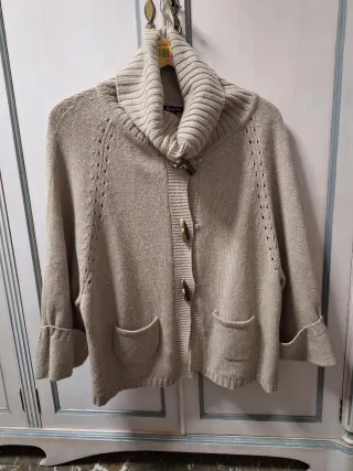 Jersey de punto grueso con cuello alto. Es una talla 46/48. De axila a axila tiene 54 CMS ( unos 108 en total) - Tejido texturizado. - Manga larga. - Cuello alto. - Sólo se usó una vez, luego se lavó y se guardó.