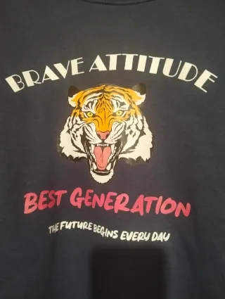 Sudadera azul con un diseño llamativo de tigre y texto. - Estampado frontal con tigre y BRAVE ATTITUDE. - Frase BEST GENERATION y THE FUTURE BEGINS EVERY DAY debajo. - Cuello redondo y mangas largas. Talla desde Xs a L