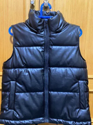 Chaleco negro acolchado con cuello alto. - Cierre de cremallera frontal. - Bolsillos laterales. - Material efecto piel.