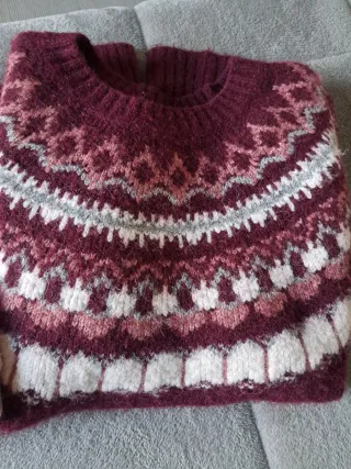 Jersey de punto de cuello vuelto, mezcla acrílico y poliéster. La talla es como una M, como hasta 165cm de estatura y 58kg aproximadamente, ver medidas en las fotos. Me lo he puesto sólo una vez, tengo la piel muy sensible y al rato me picaba un poco en el cuello, si tienes la piel sensible no lo recomiendo. Está impecable, sin bolitas ni otros defectos, sí se llegó a estrenar pero está nuevo como recién salido de tienda.