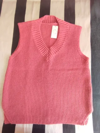 Chaleco de punto en color coral, ideal para añadir un toque de estilo a tu vestuario. - Diseño de punto acanalado. - Cuello en V. - Sin mangas.