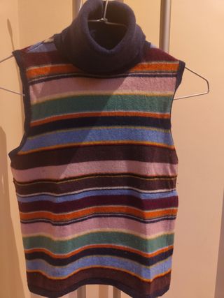 Chaleco de rayas con cuello alto y sin mangas. Un diseño llamativo y versátil. - Tejido suave y cómodo. - Patrón de rayas multicolor.