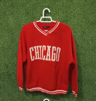 Sudadera estilo vintage con el nombre de Chicago. - Diseño con cuello en V y ribetes blancos. - Estampado grande de CHICAGO en blanco. - Puños y bajo con banda elástica y ribetes.