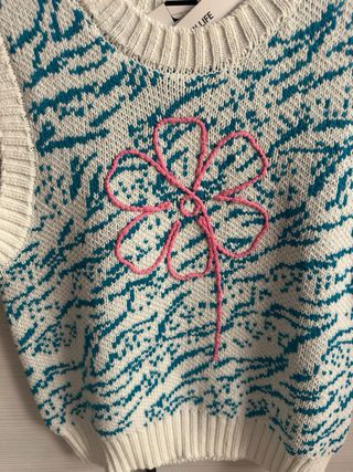 Chaleco de punto con un diseño llamativo y un detalle de flor bordada. - Tejido de punto con estampado. - Detalle de flor bordada en hilo rosa. - Cuello redondo y sin mangas.