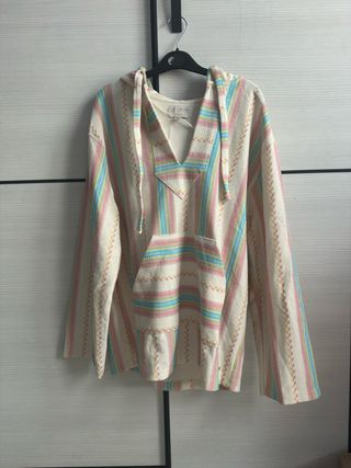 Sudadera con capucha y estampado de rayas verticales en tonos pastel. Diseño tipo poncho con bolsillo frontal. - Diseño de rayas verticales. - Cuello con capucha y cordones. - Bolsillo canguro en la parte delantera.