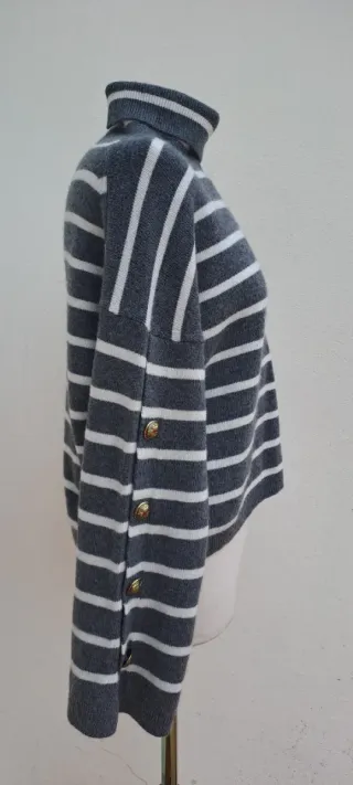 Jersey de punto fino con cuello alto y estampado de rayas horizontales. Ideal para un look elegante y abrigado. - Diseño de rayas en contraste. - Puños con detalle de botones. - Tejido suave al tacto. - Anchura de axila a axila 40,5 cm.