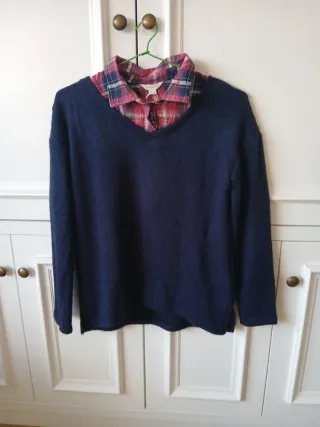Jersey de cuello pico con efecto de camisa de cuadros debajo. Sin estrenar con su etiqueta original. - Jersey de punto fino azul marino mas largo por la espalda. Con acabado recto y abierto en los lados.