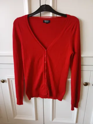 Chaqueta fina de punto en color rojo, ideal para añadir un toque de color a tu vestuario. - Diseño de punto fino. - Cuello en V. - Cierre de botones.