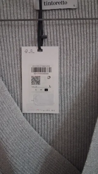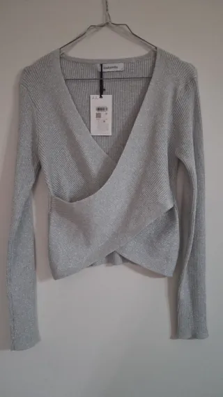 Jersey de manga larga en color gris claro con hilos plateados. Diseño cuello en V y cruzado. Tejido principal es viscosa. Nuevo con etiqueta