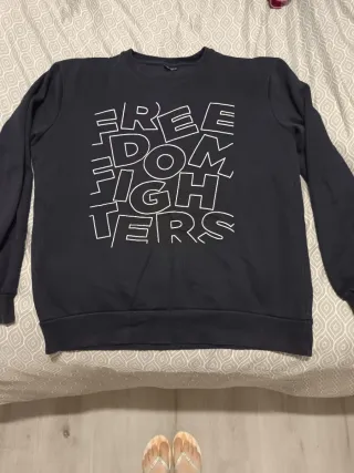 Sudadera azul marina talla L, con estampado gráfico. - Diseño Freedom Fighters en blanco. - Manga larga. - Cuello redondo.