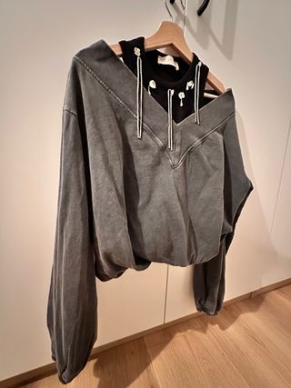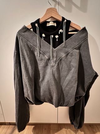 Conjunto de sudadera gris y top negro con detalles de pedrería. - Sudadera de corte amplio con cuello en V. - Top negro con tirantes finos. - Adornos de brillantes en el escote del top. Ambas piezas están unidas, es una sola. Usada en una única ocasión. Es una prenda de la tienda Capriche.