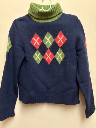 Jersey de punto con cuello alto y un clásico estampado de rombos. - Diseño de rombos en rojo y verde. - Cuello alto acanalado en verde. - Manga larga.