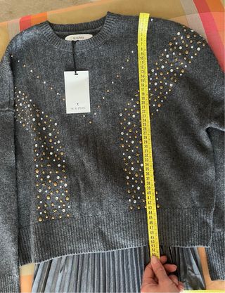 Jersey de Scalpers en color gris, con un diseño de pedrería en la parte delantera. - Cuello redondo. - Manga larga. - Detalle de tachuelas y pedrería. Está nuevo, con etiquetas. Lo vendo porque ha sido un regalo, no me cuadra y se me ha pasado el plazo de devolución.