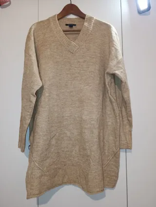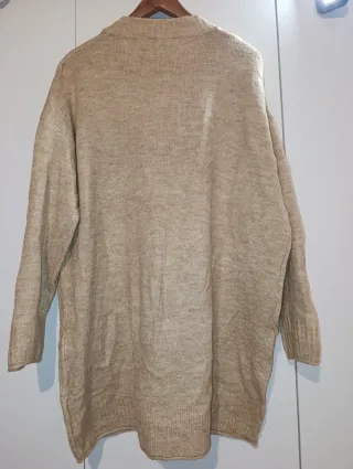 Suéter de punto de Esmara, en color crema/beige, con cuello en pico, manga larga y bajo asimétrico con detalle. Talla L/44-46. Acrílico, elastano y poliéster. Medidas: 85 cms largo x 65 cms ancho hombros x 61 cms ancho axial x 51 cms largo manga. En excelente estado.