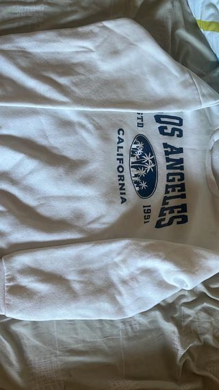 Sudadera blanca con estampado de Los Angeles California. - Diseño con palmeras. - Cuello redondo.