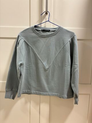 Vendo jersey de Stradivarius, talla XS, en tonos azul y verde con estampado en zig-zag. Corte corto (crop), manga larga y tejido agradable. Está en perfecto estado, apenas usado. Ideal para looks casuales o de entretiempo. Entrega en mano o envío por Wallapop. - Diseño de espiga. - Cuello redondo. - Bajo y puños de canalé.