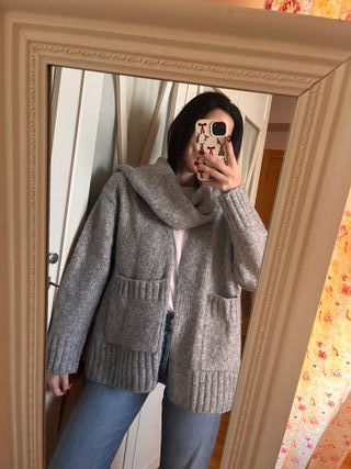 Cárdigan de lana gris de Zara, con bufanda integrada. Es una prenda muy calentita y cómoda. - Diseño de punto grueso. - Bolsillos delanteros. - Cuello tipo bufanda.