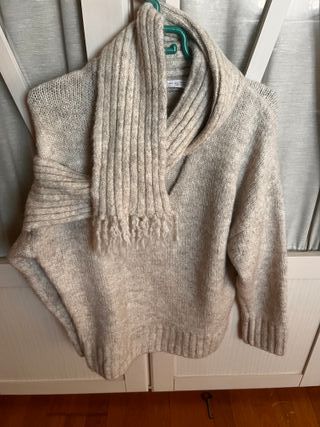 Conjunto de jersey y bufanda en color beige. - Jersey de punto con cuello en V. - Bufanda a juego con acabado deshilachado.