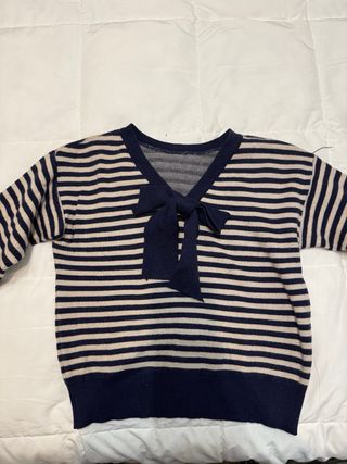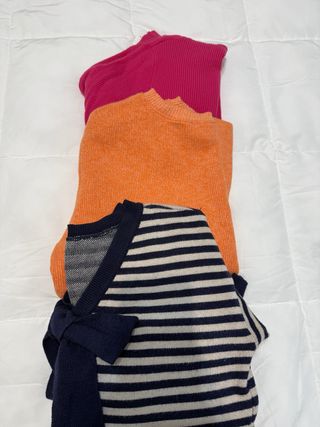 Conjunto de tres jerseys de diferentes colores de talla mediana de tienda local y de zara, en buen estado - Jersey de color rosa con cuello redondo. - Jersey de color naranja con cuello redondo. - Jersey a rayas azul marino y blanco con cuello en V.
