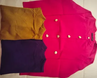 Conjunto de tres prendas de punto, ideal para añadir variedad a tu armario. Incluye un jersey verde, un jersey morado y una rebeca fucsia. - Jersey de cuello perkins en color verde, manga corta. - Jersey de cuello perkins en color morado,manga corta. - Rebeca de punto,en color fucsia con botones dorados, manga larga.