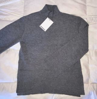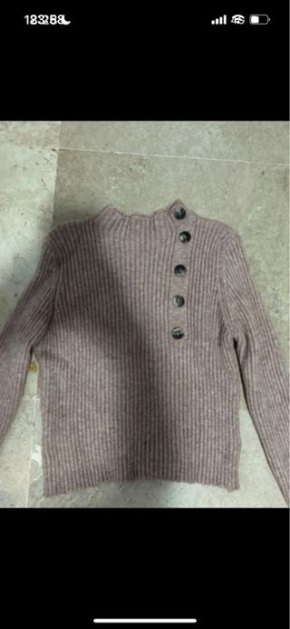 Jersey de punto con cuello alto, ideal para un look cómodo y elegante. Talla M. En perfecto estado. - Tejido de canalé. - Diseño asimétrico en el bajo. - Mangas tres cuartos.
