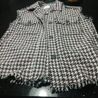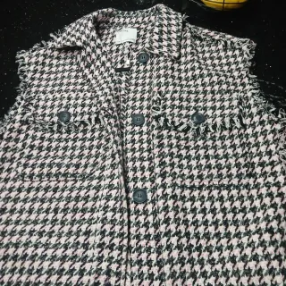 Chaleco de mujer con estampado houndstooth en tonos negro y rosa. Presenta un diseño moderno con detalles deshilachados en los bolsillos y los bajos. - Cierre de botones. - Dos bolsillos en el pecho. - Cuello camisero.
