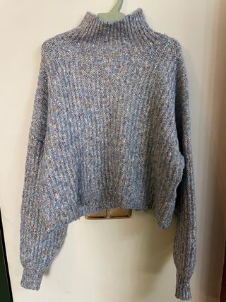 Jersey de punto grueso con cuello alto. Su diseño jaspeado le da un toque moderno. - Tejido suave y cálido. - Mangas largas abullonadas. - Corte cropped.