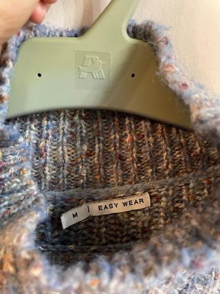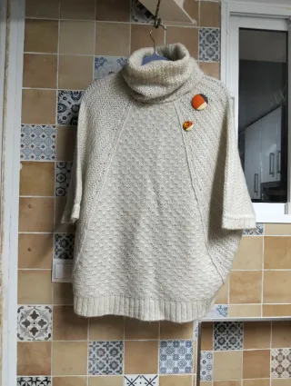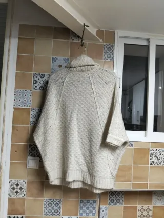 Jersey de punto con cuello con varias formas. Presenta un diseño tipo ochos en la parte delantera. Talla M pero puede servir para L. Punto muy blandito y ligero. Muy pocas puestas. Sin bolas. Perfecto estado. - Tejido de punto. - Cuello varias formas - Diseño original