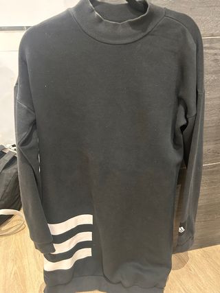 Vestido tipo sudadera de Adidas. Diseño cómodo y moderno. - Cuello alto acanalado. - Detalle de tres rayas blancas en el lateral inferior. - Logo de Adidas en la manga.