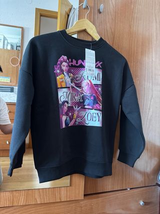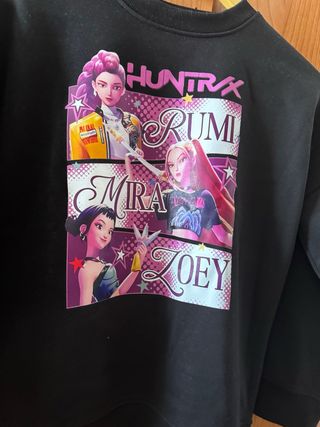 Sudadera con un diseño llamativo inspirado en el K-Pop. - Estampado frontal con personajes y nombres. - Cuello redondo. - Manga larga. -100% algodon.