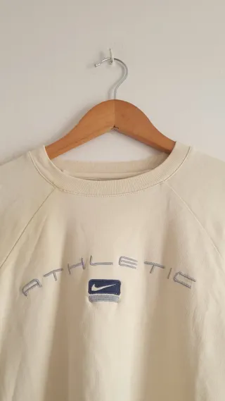 Sudadera de estilo retro con un diseño deportivo. Defecto : ver dos últimas fotos Da talla de XS de adulto. - Logo de Nike bordado. - Detalle Athletic en la parte frontal. - Cuello redondo y manga larga.