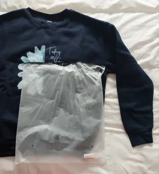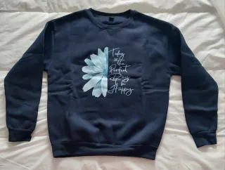 Sudadera azul con diseño de flor y texto - Estampado de media flor en tonos azules y blancos. - Cuello redondo y mangas largas. Sin estrenar. No elegí bien la talla y no pude devolverlo.