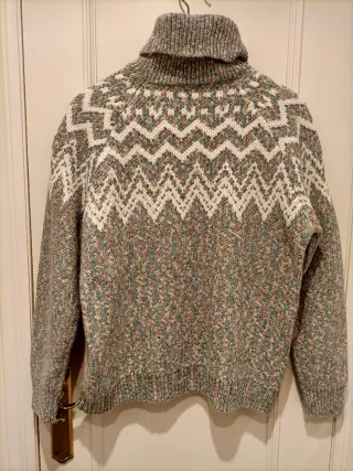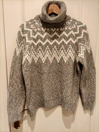 Jersey de punto con cuello alto y diseño de zig-zag. - Tejido cálido y confortable. - Estampado geométrico en contraste. - Acabado jaspeado en mangas y cuerpo. En la foto parece gris, en la última foto se aprecia mejor el color aunque es más bonito que en la foto