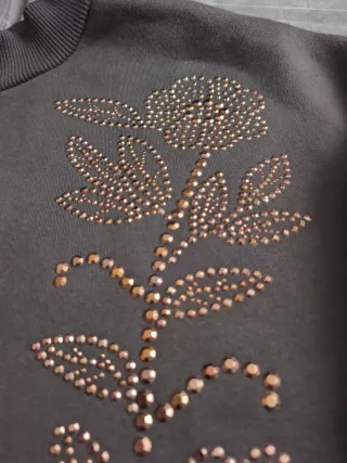 Sudadera gris con detalle de flores en pedrería. - Diseño con cuello redondo. - Puños y bajo elásticos.
